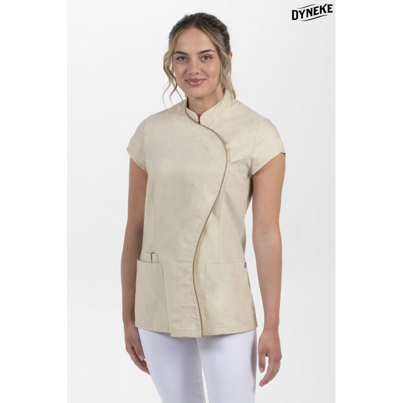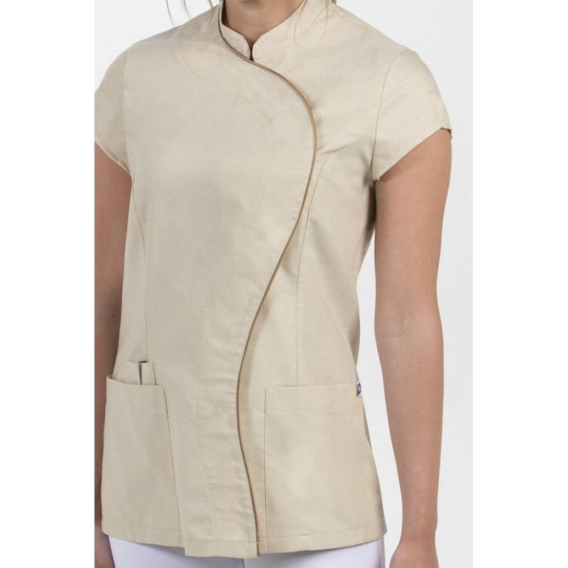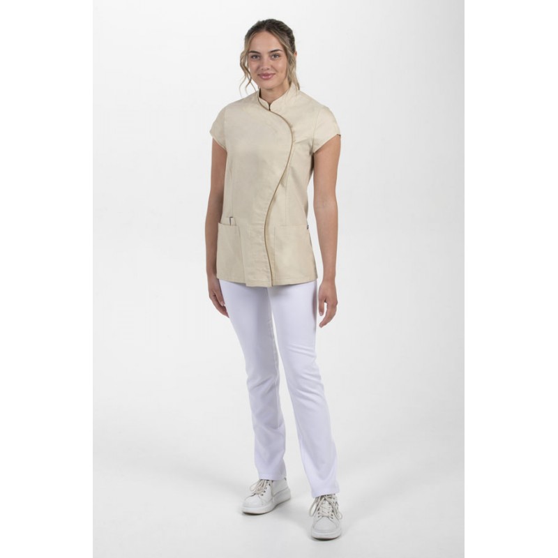 Chaqueta beige escote alto, manga corta Chaqueta para comercio, salud y estética en manga corta. Color beig con vivos blancos en cuello escote alto.