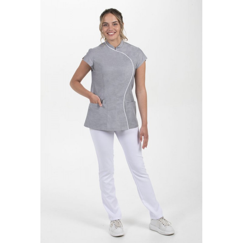 Casaca gris entallada para spa , estética y comercio. Manga corta . Cuello mao con escote