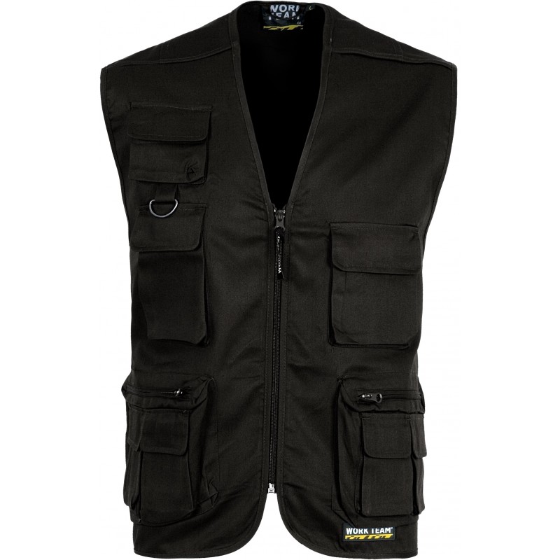 Chaleco con cierre de cremallera de nylon. Escote a pico. Tres bolsos de pecho de distinto tamaño con carteras de velcro.